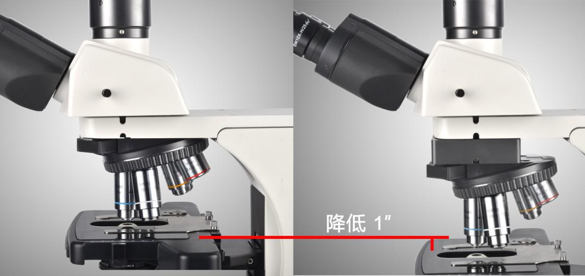 通過物鏡轉換器墊片可將載物臺高度從標準位置降低1″,以便輕松更換標本,同時保持舒適的姿勢。