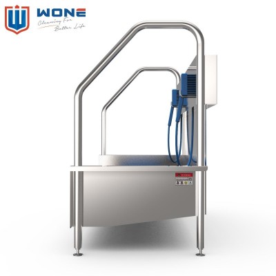 該款膠靴清潔機采用食品衛生級設計,全不銹鋼機體,大傾角排水設計,更加容易清潔,衛生標準更高,高效解決重油污、重污垢的長膠靴刷洗。