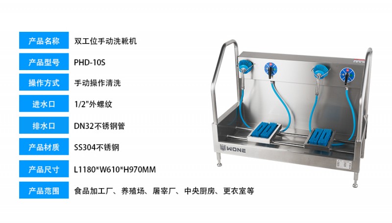 PBW-M2不銹鋼兩工位洗靴機,具備清潔劑和清水自由切換的功能閥,手刷內部噴水設計,可以一遍刷洗一遍沖水,便捷高效清潔長靴、膠靴、雨鞋、工作鞋等。
