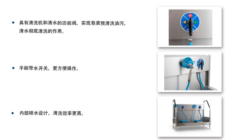 手動洗靴機具有清洗機和清水的功能閥,實現皂液預清洗油污,清水徹底清洗的作用。