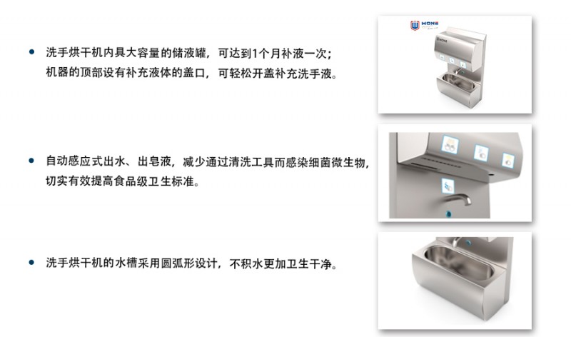 壁掛式洗手烘干消毒機更加節省空間,具備普通的不銹鋼感應洗手池的全部功能,包括具有紅外線自動感應出水;洗手水槽是防水濺設計,減少手部二次污染。