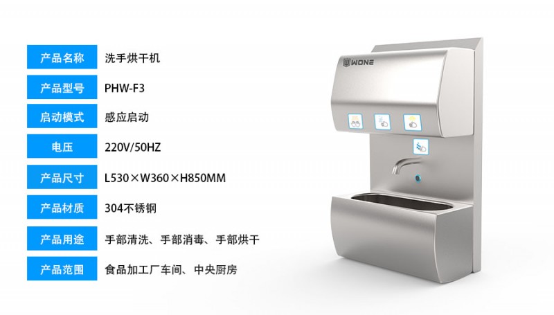 PHW-F3洗手烘干消毒機結構緊湊,壁掛式更節省空間,具備普通的不銹鋼感應洗手池的全部功能,實現了傳統洗手烘干機和感應式烘干器10秒快速干手的功能,同時具備1升容量的噴霧消毒功能。