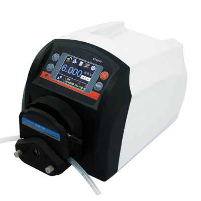 BT601F分配型智能蠕動泵流量范圍0.006~2900毫升/分鐘。采用彩色液晶和觸摸屏技術,操作界面簡單,直觀,明了。主要適用于各種復雜的液體定量分配,適用于精確計量和定量給料,可以實現高精度的流量傳輸控制。對液量分裝精度要求高時,使用液量分配模式更加方便;對產量要求高時,使用時間分配模式更加方便;需要將一定液體分裝為若干份液體時請使用復制分配模式。設置為流量模式時,完全等同于一臺流量型蠕動泵。為了減小不必要的風扇噪音,采用了智能溫控技術。在RS485通訊中,因為采用了MODBUS協議,更易于與其他控制設備如計算機,人機界面,PLC等連接。
