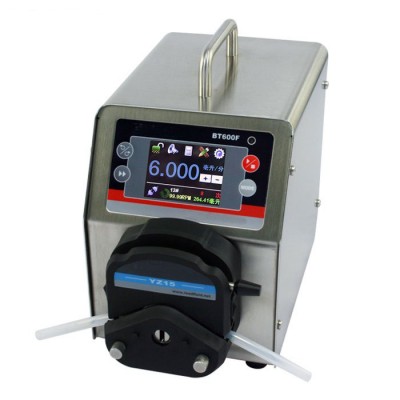 BT600F分配型智能蠕動泵流量范圍0.006~2900毫升/分鐘。采用彩色液晶和觸摸屏技術,操作界面簡單,直觀,明了。主要適用于各種復雜的液體定量分配,適用于精確計量和定量給料,可以實現高精度的流量傳輸控制。對液量分裝精度要求高時,使用液量分配模式更加方便;對產量要求高時,使用時間分配模式更加方便;需要將一定液體分裝為若干份液體時請使用復制分配模式。設置為流量模式時,完全等同于一臺流量型蠕動泵。為了減小不必要的風扇噪音,采用了智能溫控技術。在RS485通訊中,因為采用了MODBUS協議,更易于與其他控制設備如計算機,人機界面,PLC等連接。
