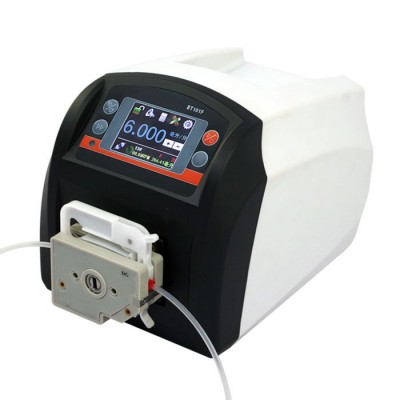 BT101F分配型智能蠕動泵流量范圍0.00011~720毫升/分鐘。采用彩色液晶和觸摸屏技術,操作界面簡單,直觀,明了。主要適用于各種復雜的液體定量分配,適用于精確計量和定量給料,可以實現高精度的流量傳輸控制。對液量分裝精度要求高時,使用液量分配模式更加方便;對產量要求高時,使用時間分配模式更加方便;需要將一定液體分裝為若干份液體時請使用復制分配模式。設置為流量模式時,完全等同于一臺流量型蠕動泵。為了減小不必要的風扇噪音,采用了智能溫控技術。在RS485通訊中,因為采用了MODBUS協議,更易于與其他控制設備如計算機,人機界面,PLC等連接。