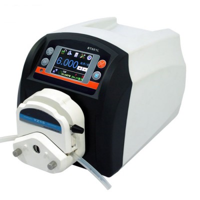 BT601L流量型智能蠕動泵流量范圍0.006~2900毫升/分鐘。采用彩色液晶和觸摸屏技術(shù),操作界面簡單,直觀,明了。主要適用于精準(zhǔn)流量傳輸控制,用戶可以根據(jù)自己的需要流量顯示,流量控制,流量累計(jì)。同時本產(chǎn)品實(shí)現(xiàn)了重復(fù)定時定量傳輸。適用于精確計(jì)量和定量給料,精度最高可達(dá)0.5%,為了減小不必要的蠕動泵噪音,采用了智能溫控技術(shù)。在RS485通訊中,因?yàn)椴捎昧薓ODBUS協(xié)議,更易于與其他控制設(shè)備如計(jì)算機(jī),人機(jī)界面,PLC等連接。